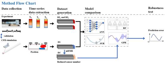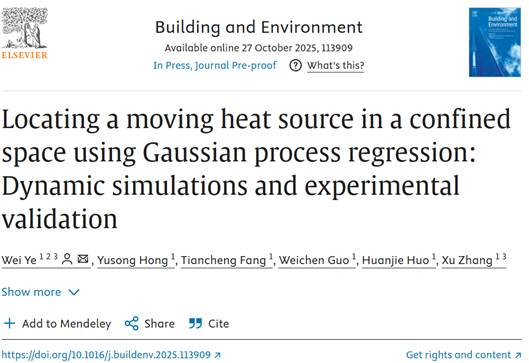 近期,课题组硕士生洪钰淞(导师:叶蔚副教授)在 Building and Environment(Q1,IF:7.6)上发表了基于高斯过程回归的受限空间中移动热源定位研究。该研究探讨了在低可视度和复杂气流条件下,通过温度场反演实现移动热源定位的可行性。构建了包含多种热源强度、运动轨迹及通风条件的计算流体动力学(CFD)数值模型,并搭建实验平台获取对比数据。利用高斯过程回归(GPR)方法建立了温度分布与热源位置的映射模型,对比了四种核在预测性能上的差异。结合支持向量回归(SVR)、随机森林(RF)和人工神经网络(ANN)模型进行误差分析。进一步采用最小冗余最大相关(mRMR)算法进行传感器布置优化,在仅保留6个关键传感器的条件下,定位误差保持在0.2 m以内。最后通过引入高斯噪声与传感器漂移误差,评估了模型的鲁棒性与误差敏感性。