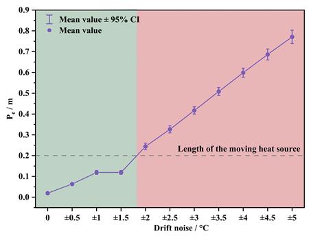 4. 在随机噪声幅度小于±0.8 °C时,模型误差稳定控制在0.2 m以内;当噪声进一步增大或传感器出现±1.5 °C以上系统漂移时,定位误差迅速上升;在漂移达到±5 °C时,误差增长至约1 m。
