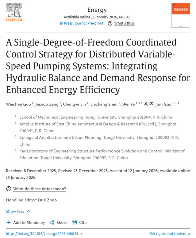 冷冻水输送是传统阀门调节式HVAC系统能耗的重要组成部分。虽然分布式变速泵(DVSP)系统通过用泵替代阀门消除了节流损失,但其多自由度控制面临一个核心矛盾:恒定流量运行缺乏需求响应能力,而需求调节又会因终端间流量分配不均导致水力失衡。尽管现有优化算法可以解决此矛盾,但它们计算复杂,难以轻量化部署。为应对这一根本性挑战,本研究开发了一种新颖的单自由度协调控制策略。该方法的核心创新在于其显式的白箱算法,能将复杂的多自由度问题有效地简化为通过单一基准输入直接确定所有泵的转速。这显著区别于传统黑箱优化方法固有的计算复杂性。所提出的方法本质上确保了水力平衡,同时也为集成需求响应提供了一个天然的接口。通过对上海浦东国际机场整个供冷季的全面现场实测,该算法表现出超过99.7%的预测精度,从而证实了其在实际大型基础设施应用中的可行性和直接适用性。此外,高保真仿真进一步证实,所提策略在各种系统工况下能保持优异的温度稳定性,将水力失衡率限制在1.2%以下,并实现相较于传统控制模式平均32.5%和13.1%的显著节能。本研究提出了一个统一且可扩展的控制框架,显著提升了DVSP系统的水力稳定性和能效。该成果发表在中科院一区期刊《Energy》,影响因子为9.4,论文第一作者为课题组在读博士生郭炜辰,指导老师为叶蔚副教授。